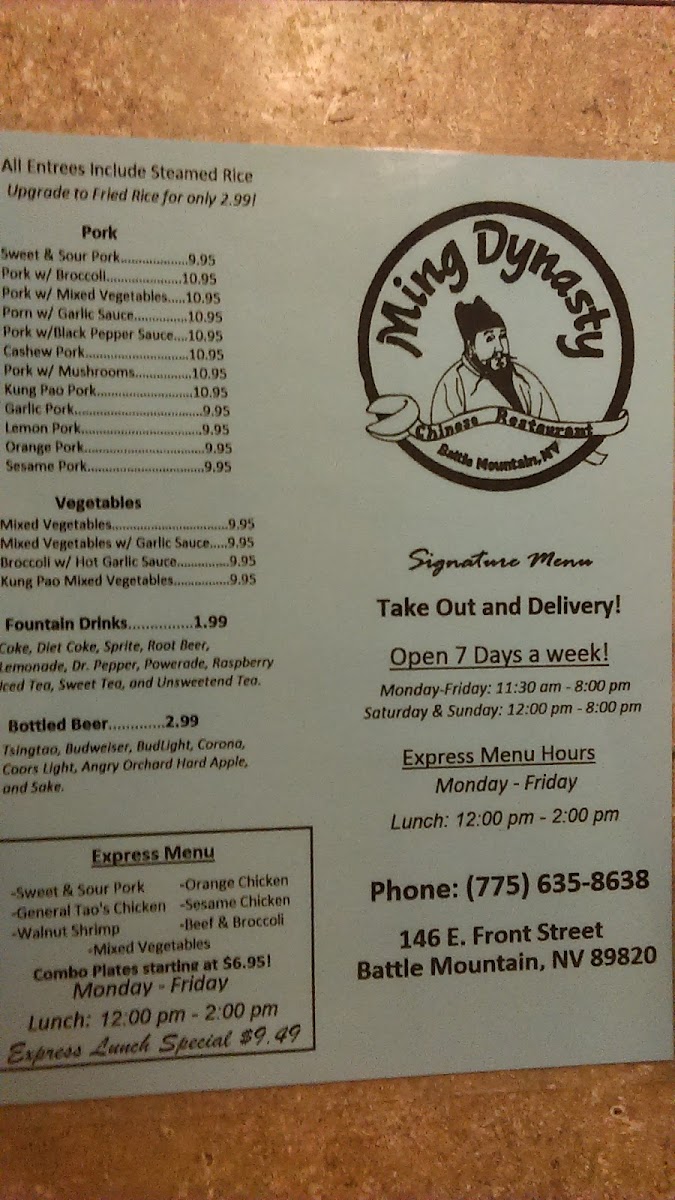 Welcome to Ming Dynasty Restaurant, a charming eatery nestled at 146 E Front St, Battle Mountain, NV. This delightful locale offers a menu brimming with flavors that resonate with culinary excellence. Renowned for its fried rice, many patrons claim it as the best they've ever tasted. The restaurant's cozy ambiance makes it ideal for a romantic date night or a fun family outing.